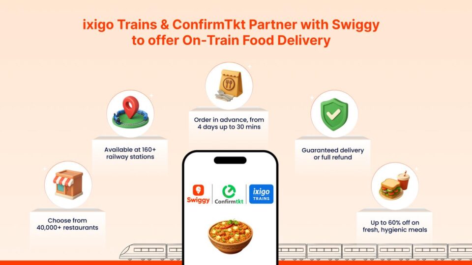 GURUGRAM, INDIA | 08th APRIL 2026 — ixigo Trains and ConfirmTkt, India’s leading AI-based train ticketing platforms, have partnered with Swiggy (Swiggy Ltd, NSE: SWIGGY / BSE: 544285), India’s pioneering on-demand convenience platform, to power its ‘Food on Train’ service. By integrating Swiggy’s restaurant network into the ixigo and ConfirmTkt apps, this collaboration provides the required solution to the “on-the-move” traveler’s hunger issue -with the same selection, reliability, and value that customers can expect from Swiggy when they order from their homes.
