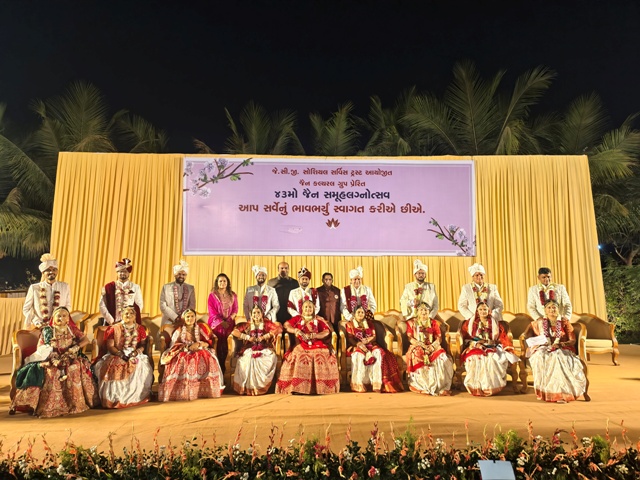 AHMEDABAD | 08th FEBRUARY 2026 — The JCG Social Service Trust organised the 43rd Jain mass marriage ceremony, during which nine couples solemnised their marriages in accordance with Jain traditions. The ceremony was held on Sunday at the Seven Seas Party Plot near Science City Circle.