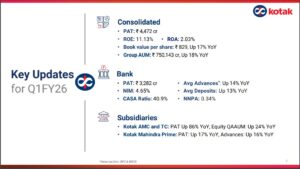 The Bank’s PAT for Q1FY26 stood at ₹ 3,282 crore (₹ 3,520 crore in Q1FY25 excluding gain of KGI divestment).