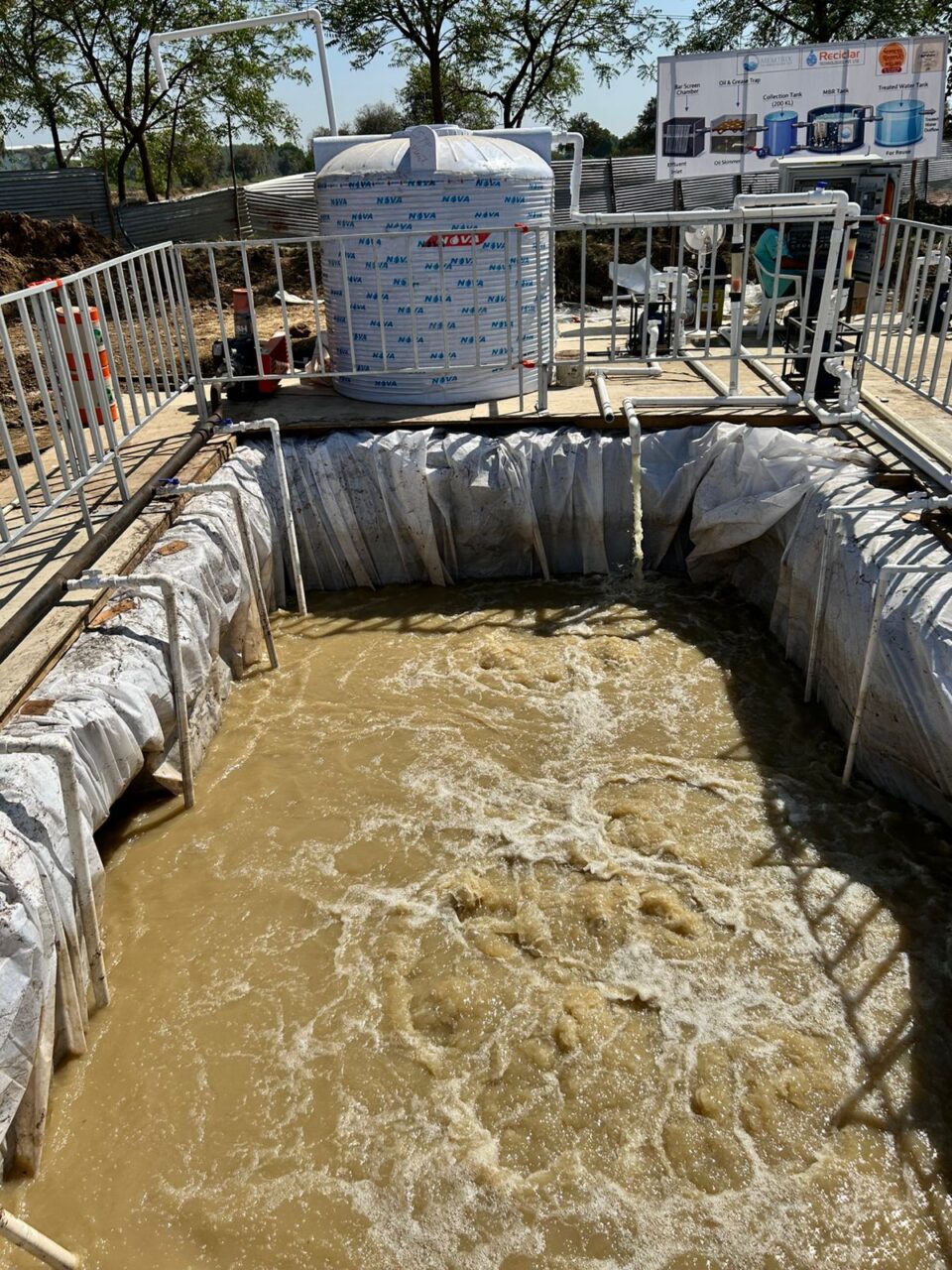 In the next stage, Biological Treatment (Aeration Tank – MBR) was carried out, where microorganisms (bacteria) were used to break down BOD, COD, and other organic substances, with air blowers supplying the required oxygen. The treated water then moved to the Secondary Settling Tank (Clarifier), where biological sludge settled at the bottom and the clear water on top was directed for further use.